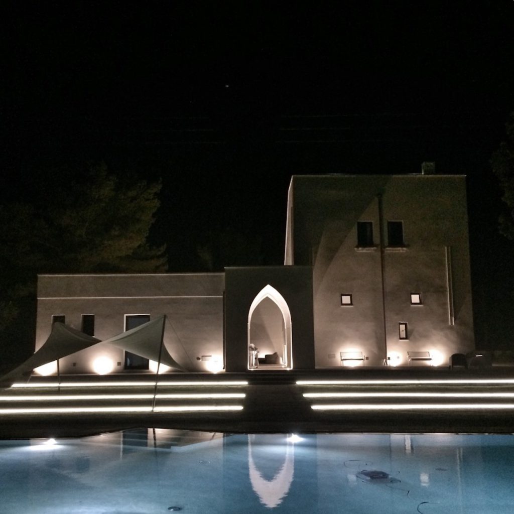 The main historical building was very badly deteriorated. Working with the local building control units, we have endeavoured to carry out a conservative refurbishment, using the typical technique of natural lime wash and polishing the internal tuff vaults. All the spaces, in style with the local Apulian architecture have been coated in lime wash and the flooring treated with polishes tuff from Lecce. Particular attention has been given to the lighting design of the outside areas and the positioning of the external bath.